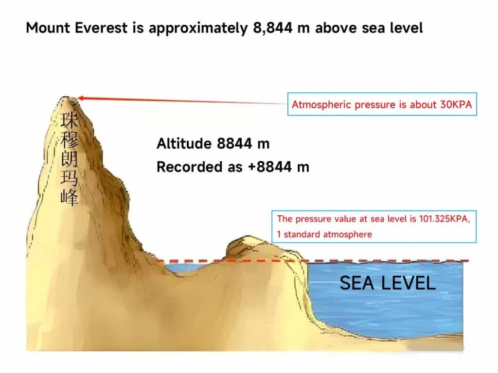 If an absolute MEMS pressure sensor with a full range of 300 mbar to 1100 mbar is used, the measurement altitude can reach 9,165 meters above sea level to 698 meters below sea level.