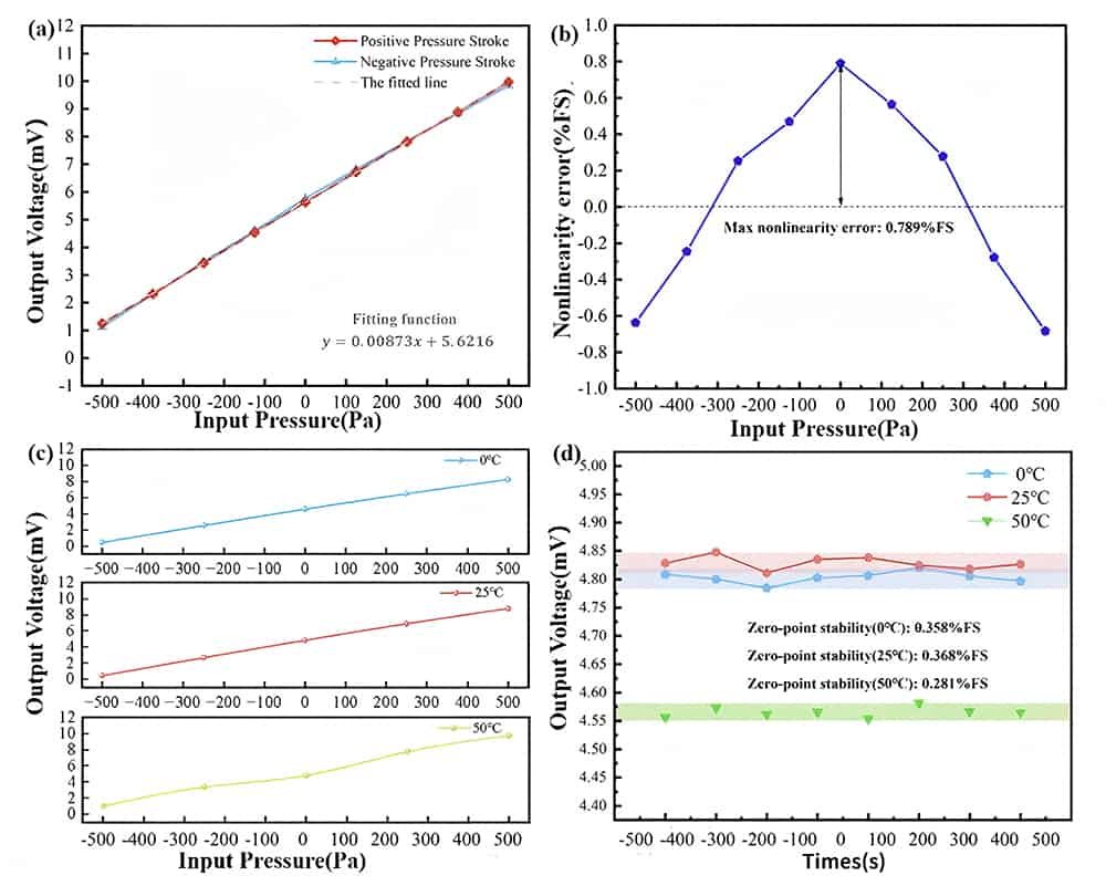 Under pressure cycles from −500 Pa to 500 Pa we tested the sensor at different temperatures (0°C, 25°C, 50°C), recording zero-point drift over time and nonlinearity curves. At room temperature the output is highly linear; under temperature changes both zero-point and full-range drift are much better than conventional circuit-based compensation, showing that the structural self-compensation is reliable and stable under dynamic thermal conditions.